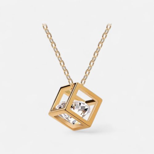 Vidd magaddal a modern luxust ezzel a különleges nyaklánccal! A minimalista design és a ragyogó fény találkozása teszi ezt a darabot a letisztult női ékszerek egyik legkeresettebb példányává. A kocka keretben szabadon mozgó, csillogó kő minden mozdulatnál újabb és újabb fényeket tör meg.