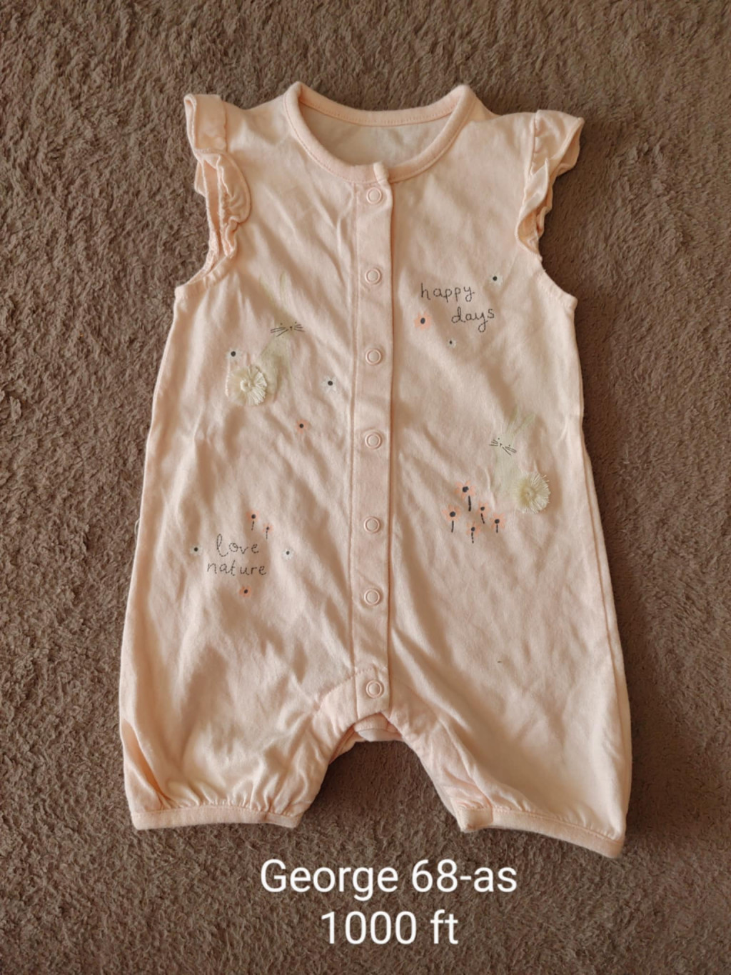 Ez a barackszínű George kislány napozó maga a megtestesült cukiság! A "Happy days" és "Love nature" feliratokkal, valamint a tüneményes 3D-s farkincájú nyuszikkal díszített ruhadarab minden kislány ruhatárát feldobja. Ha nálunk vásárolsz, tudod, hogy a minőségi babaruha és a kedvező ár kéz a kézben jár.