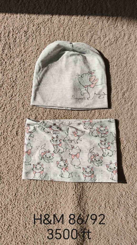 Eladó egy imádnivaló, világosszürke melanzs alapszínű, Disney Marie cicás H&M kiegészítő szett. Ez a használt babaruha tökéletes választás a tavaszi vagy őszi szezonra, hiszen stílusosan óvja a picit a széltől. A szett egy csinos sapkából és egy praktikus, könnyen felvehető csősálból áll.