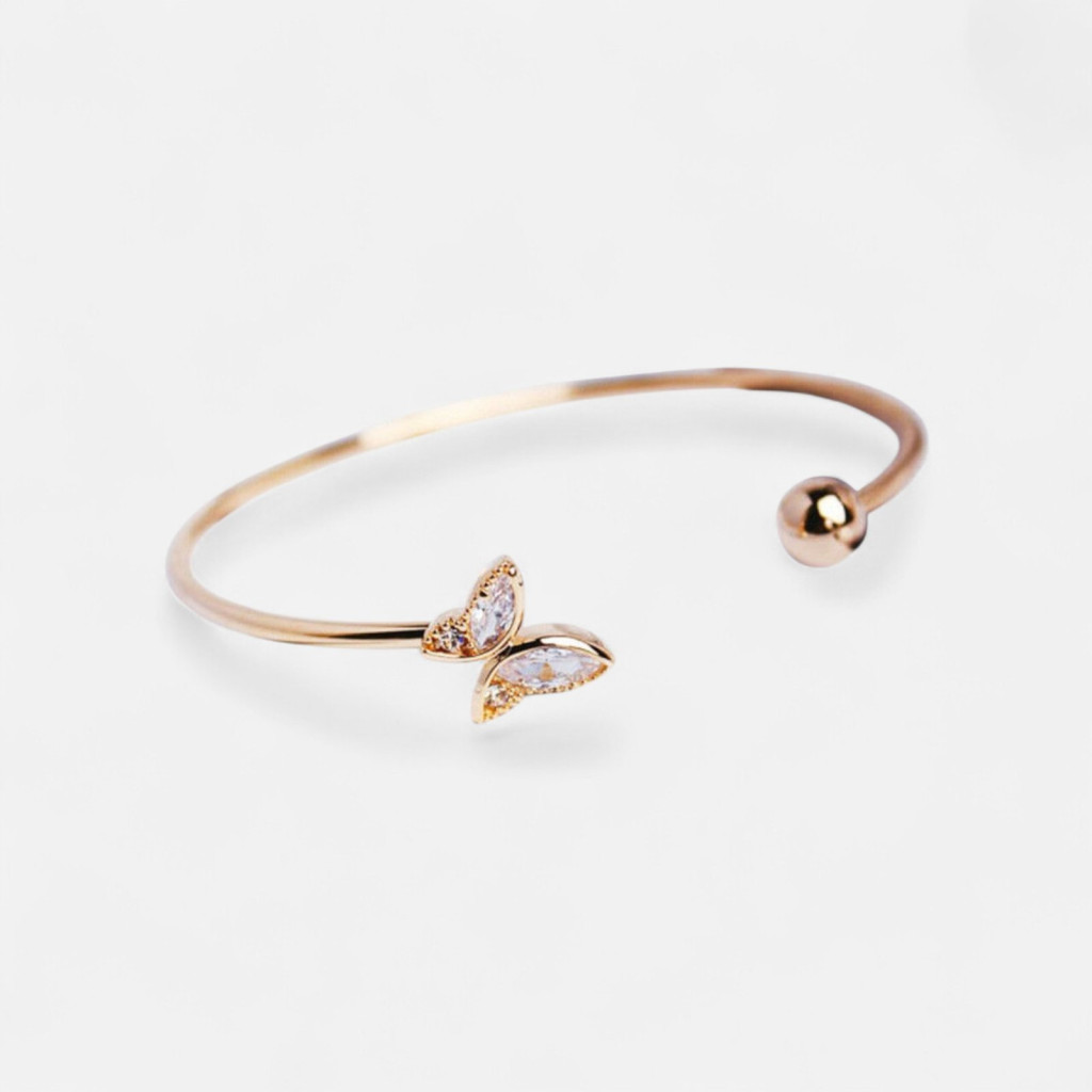 Vigyen egy csipetnyi tavaszi varázslatot a hétköznapokba ezzel a különleges, nyitott merev karkötővel! Ez a darab az elegáns kristályos női ékszerek egyik legbájosabb képviselője, ahol a finom arany tónus és a szikrázó kövekkel díszített pillangó motívum találkozik. Ha fontos Önnek a stílus, ez a letisztult női ékszer tökéletes kiegészítője lesz kollekciójának.