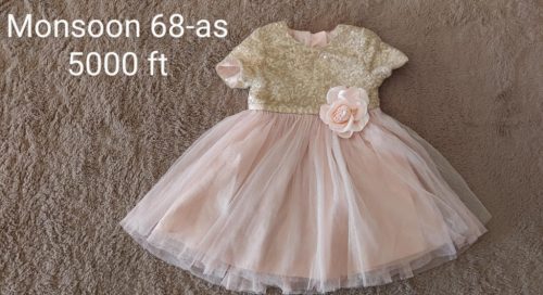 Tedd felejthetetlenné az ünnepi pillanatokat ezzel a lélegzetelállító Monsoon alkalmi ruhával! Az arany flitteres felsőrész és a lágy esésű púderszínű tüllszoknya a deréknál található elegáns rózsával kombinálva igazi prémium megjelenést biztosít. Ez a minőségi babaruha tökéletes választás keresztelőre, esküvőre vagy születésnapra.