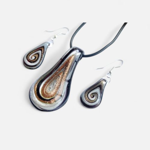 Vigyen egyedi színt és művészi eleganciát a megjelenésébe ezzel a különleges, üvegműves technikával készült ékszerszettel! Ez a szett az elegáns kristályos női ékszerek csillogását ötvözi a kézműves jellegű, spirálmintás dizájnnal. Ha Ön a letisztult női ékszerek mellett a karakteres darabokat is kedveli, ez a medálból és fülbevalóból álló párosítás lenyűgözi majd.