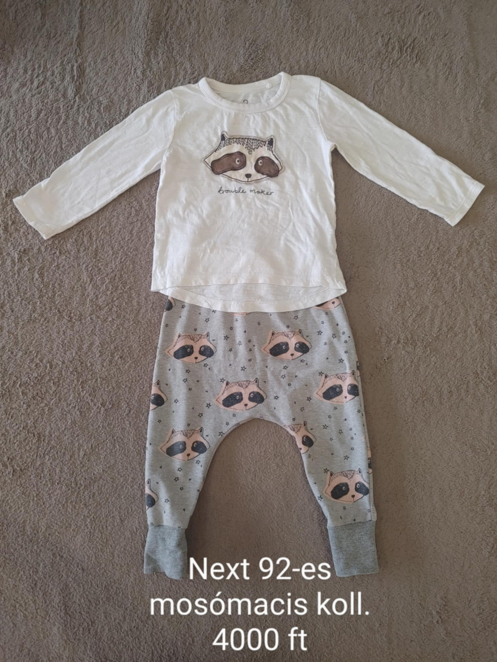 A szett egy hosszú ujjú, fehér felsőből és egy kényelmes, ejtett ülepű szürke nadrágból áll, melyet játékos mosómaci minták díszítenek. Ha számodra is szempont a fenntartható babaruha vásárlása, ez a darab ideális választás: a használt babaruha körforgásba emelésével nemcsak pénzt takarítasz meg, de a bolygónk jövőjét is véded.