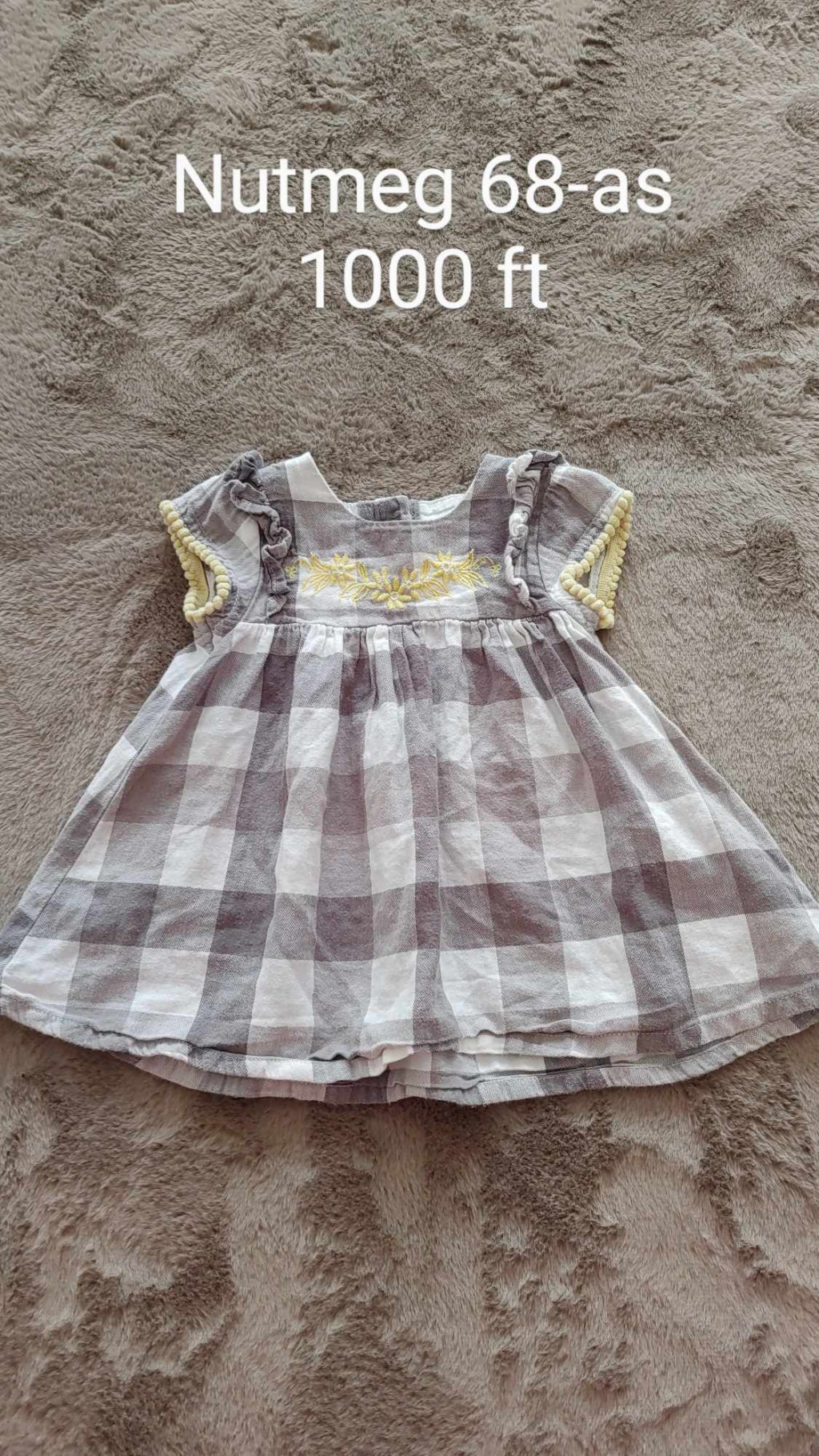 Válaszd ezt a tüneményes, szürke-fehér kockás Nutmeg ruhát, amely a sárga hímzett virágokkal és a pomponos ujjakkal válik igazán különlegessé. Ez a minőségi babaruha a vidéki romantikát idézi, miközben maximális kényelmet nyújt a kicsinek a puha, természetes anyaga révén.