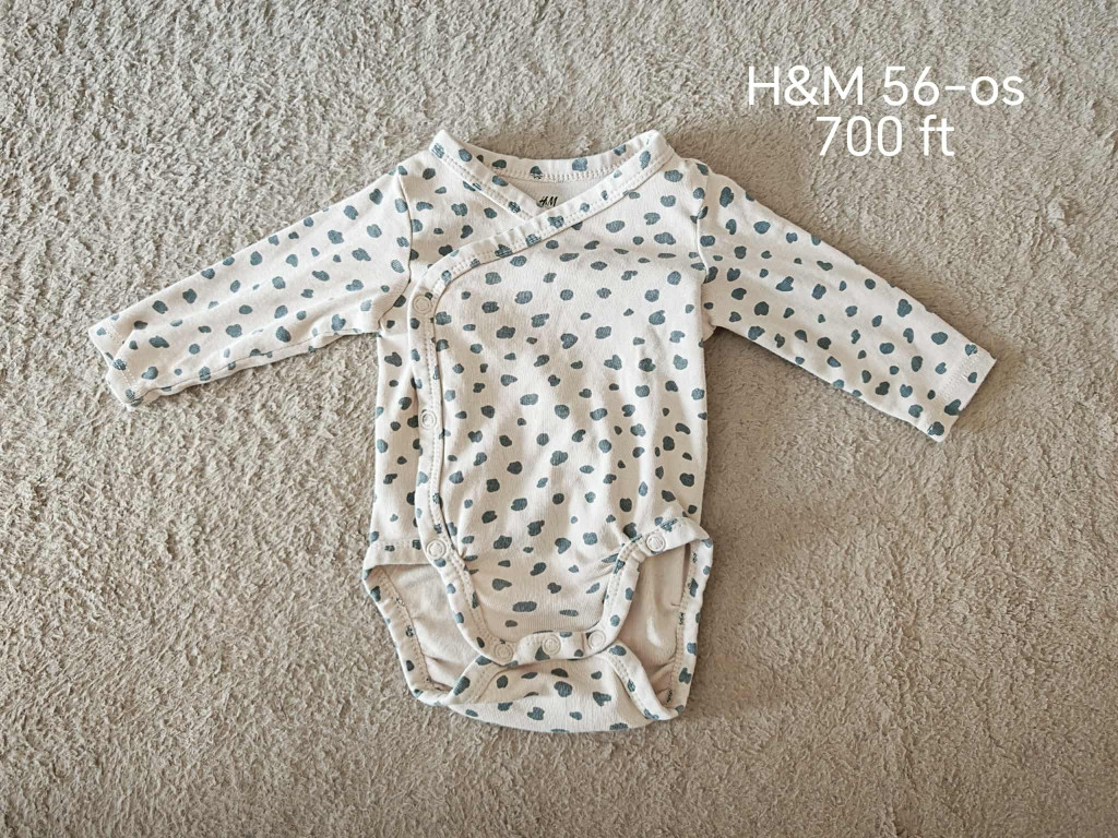 Ez a letisztult, szürke pöttyös mintával díszített H&M body minden baba alapruhatárának nélkülözhetetlen darabja. Az átlapolós (patentos) megoldás különösen praktikus az első hónapokban, hiszen megkönnyíti az öltöztetést.
