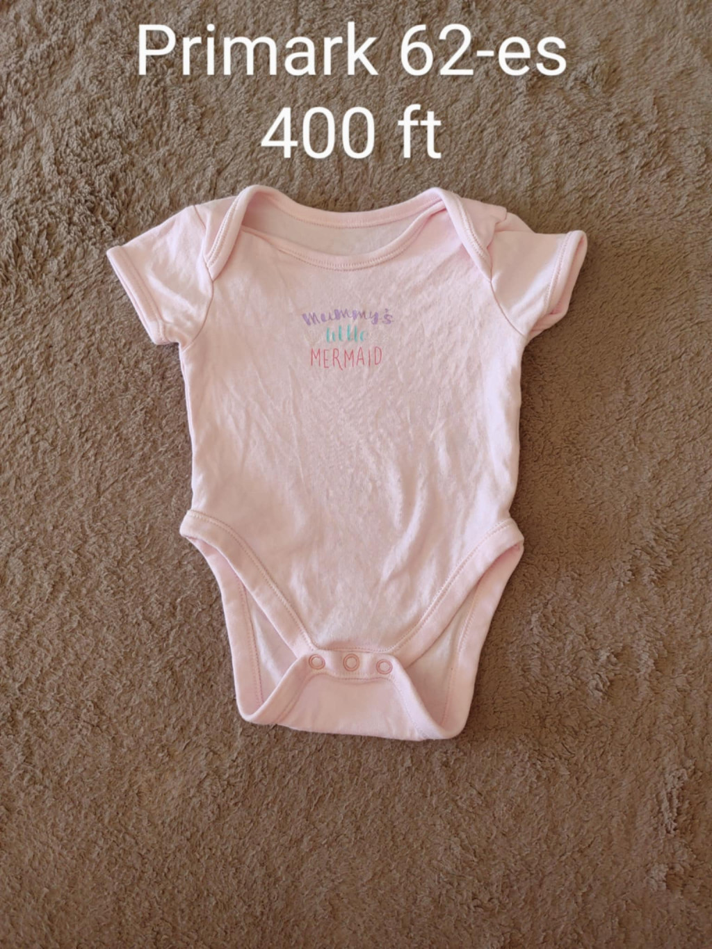 Eladó a képen látható, tündéri halványrózsaszín minőségi babaruha, amely elején ezüstös csillogású "Mermaid in training" felirattal és kagyló mintával díszített. Ez a használt babaruha kiváló állapotban van, tökéletes alapdarab minden kislány ruhatárába.