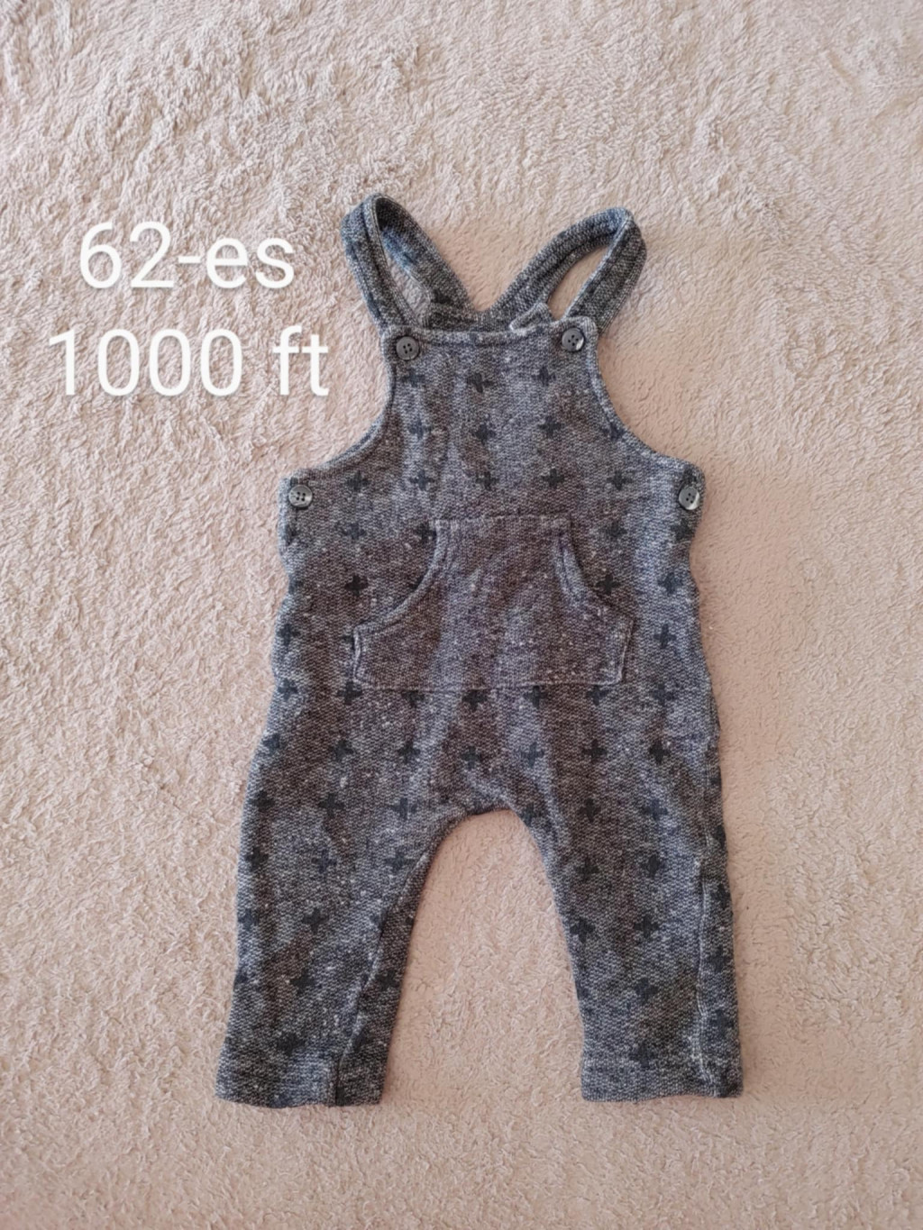 Ez a gondosan válogatott babaruha egy sötétszürke alapszínű, apró mintákkal díszített kantáros nadrág. A termék egy újszerű babaruha, amely megkímélt állapotban van, így tökéletesen alkalmas a mindennapi viseletre.
